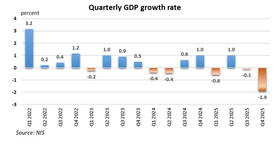 GDP estimates have been revised as of December 2025, with negative values expected for Q4, when the economic decline (-1.9%) compared to Q3 proved to be much more severe than even the rigorous forecasts. Mention should be made that most indicators correlated with GDP developments, such as the volume of trade turnover, industrial output or real wage, were already signalling a contraction trend in economic activity.
